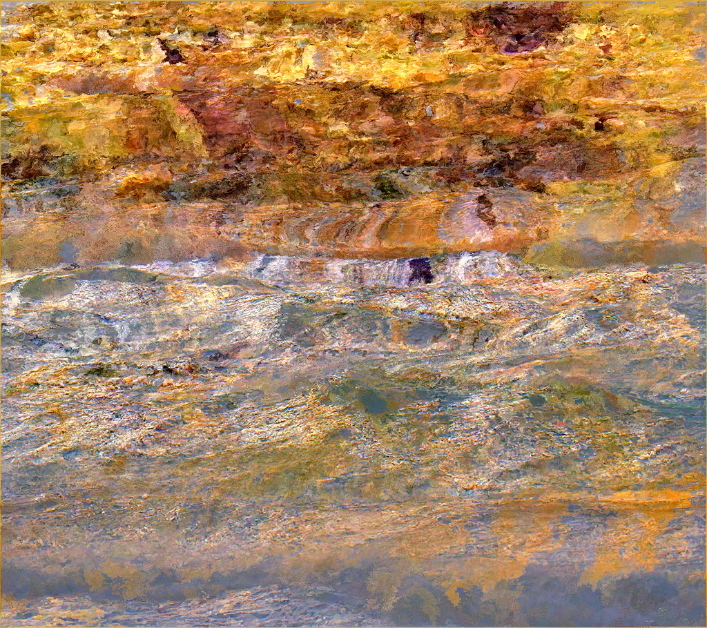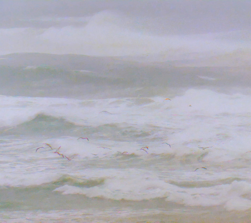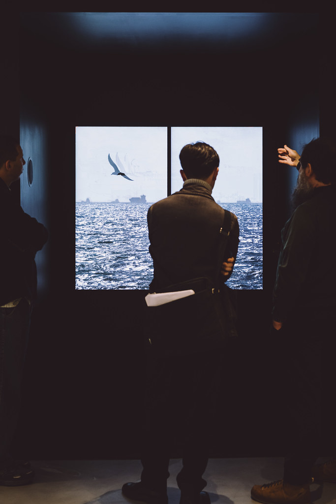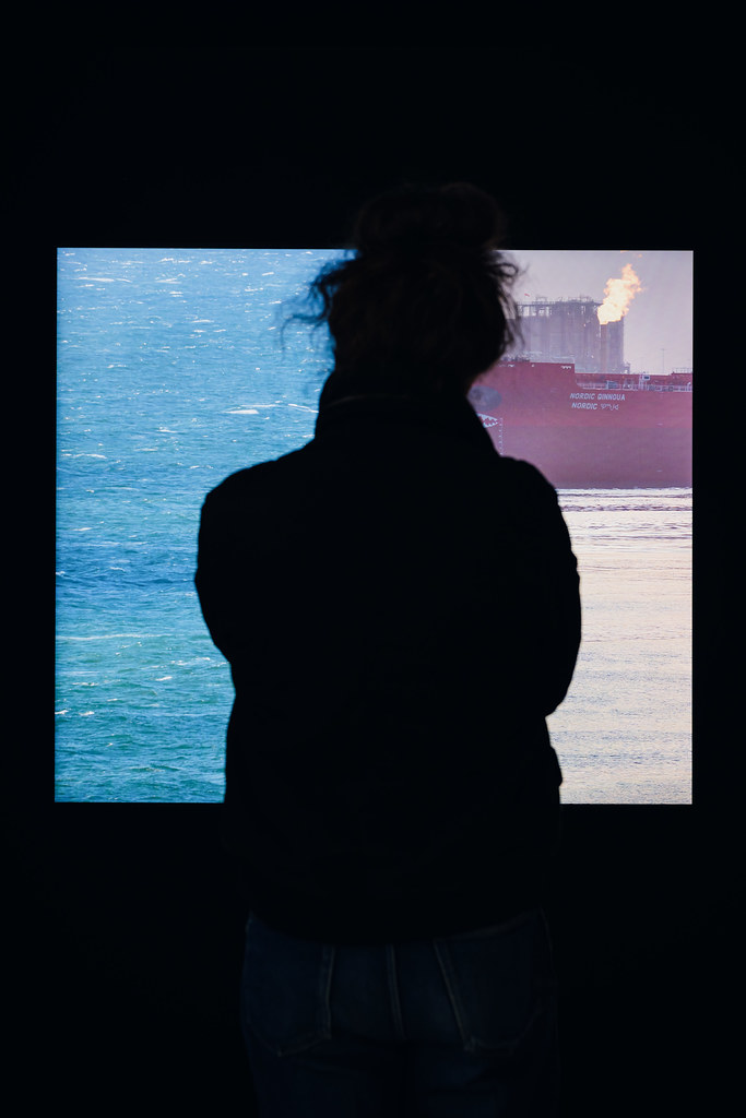 Dans un poème visuel qui se délite en millions de pixels colorés, les remous de l’écume croisent l’apparition lente de cargos titanesques, de champs d’éoliennes, de plateformes offshore et de paysages portuaires industriels.