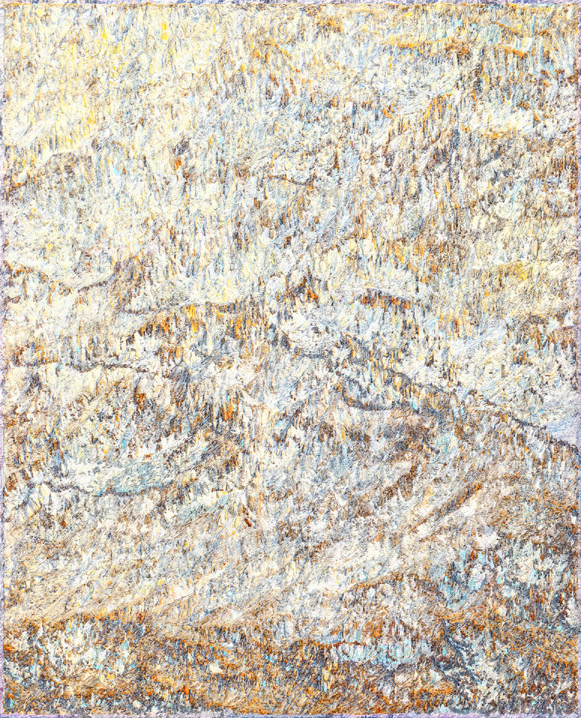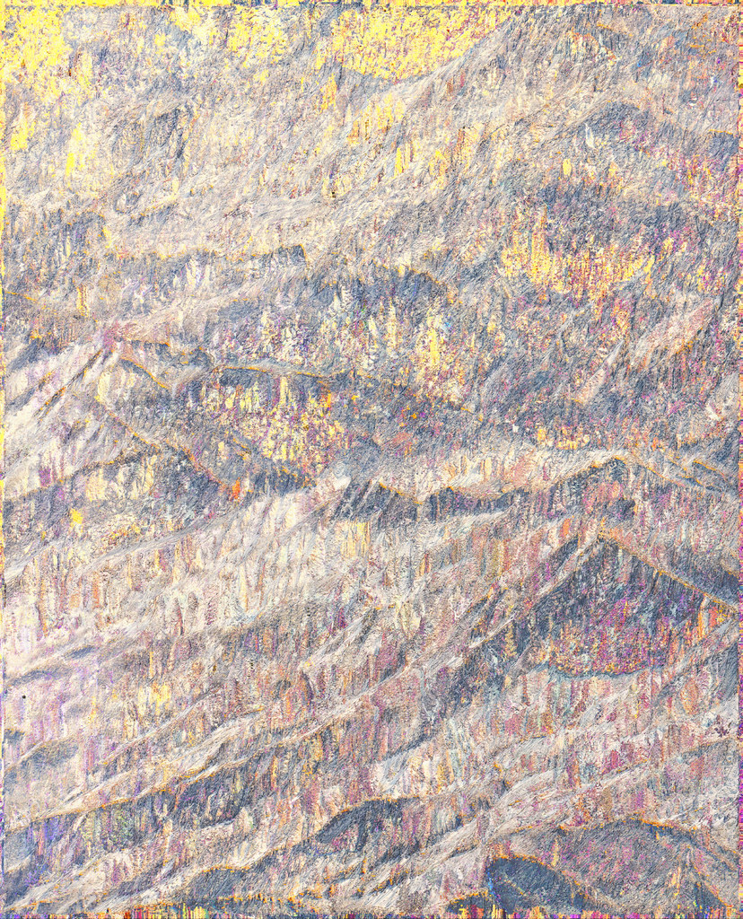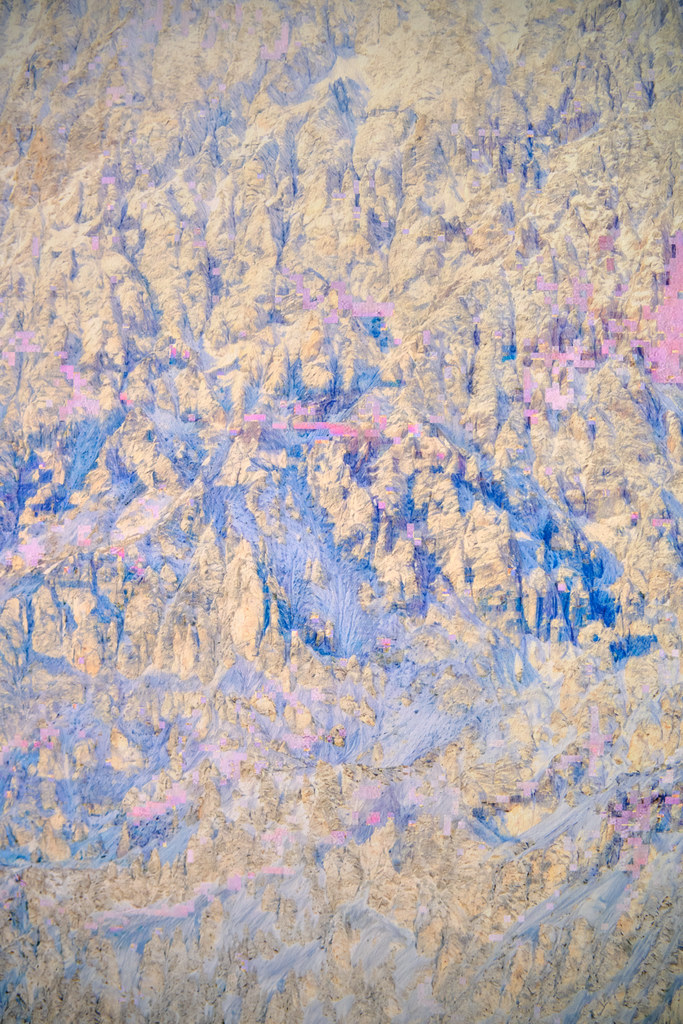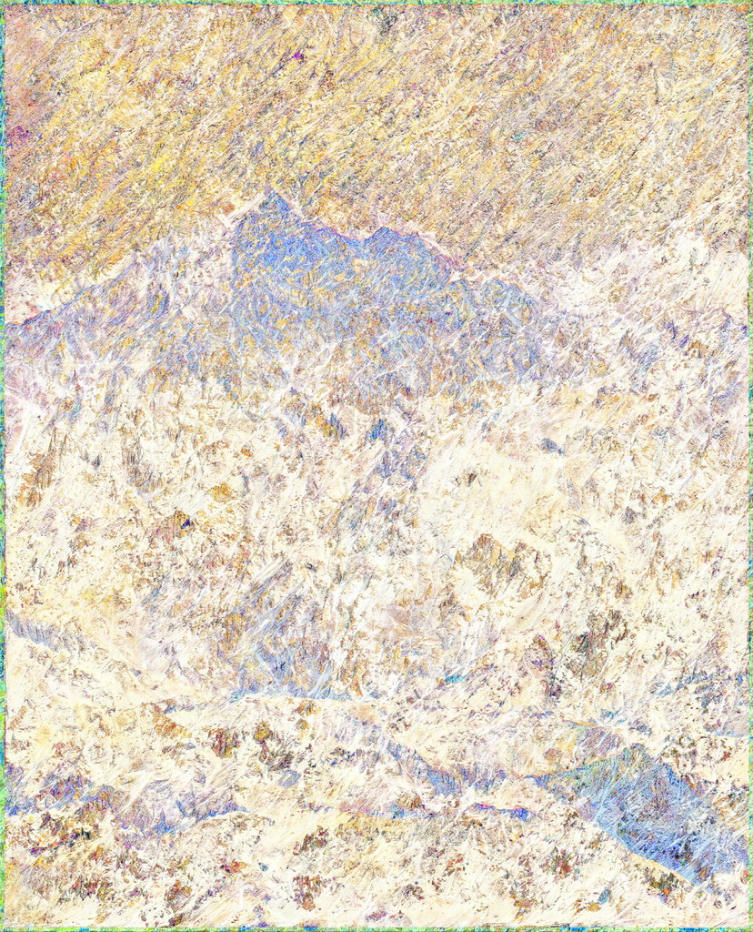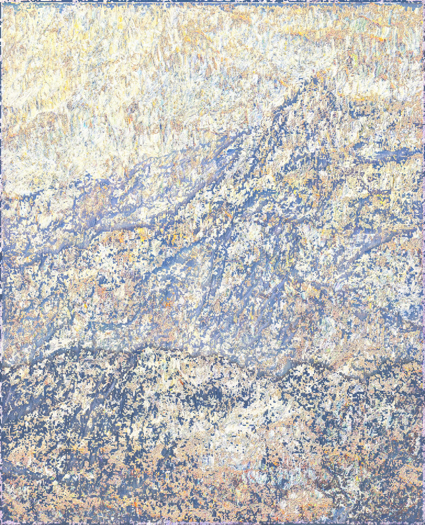 Dans cette opération, les modèles analysent les informations textuelles associées au contenu de l’image pour reconstituer vectoriellement ce que le processus créatif a volontairement fait disparaître. Un algorithme industriel standard d’agrandissement est paramétré de manière à circonscrire précisément l’espace de recherche des formes à un paysage de montagne, permettant une complétion ciblée des zones dégradées. Cette tension productive entre intention plastique et reconstruction automatisée guidée par des descriptions linguistiques contraint l’algorithme à retrouver, dans le bruit et les artefacts visuels, les éléments texturés de rocher et de glace d’une montagne devenue illisible, transformée en un vaste all-over minéral qui occupe l’intégralité de la surface picturale.