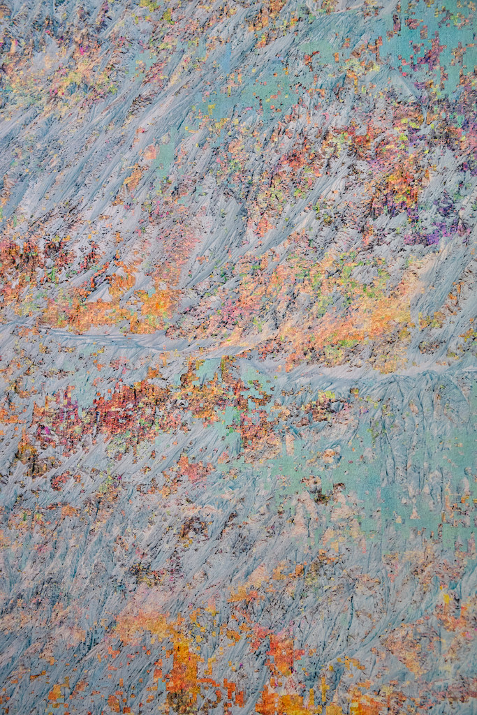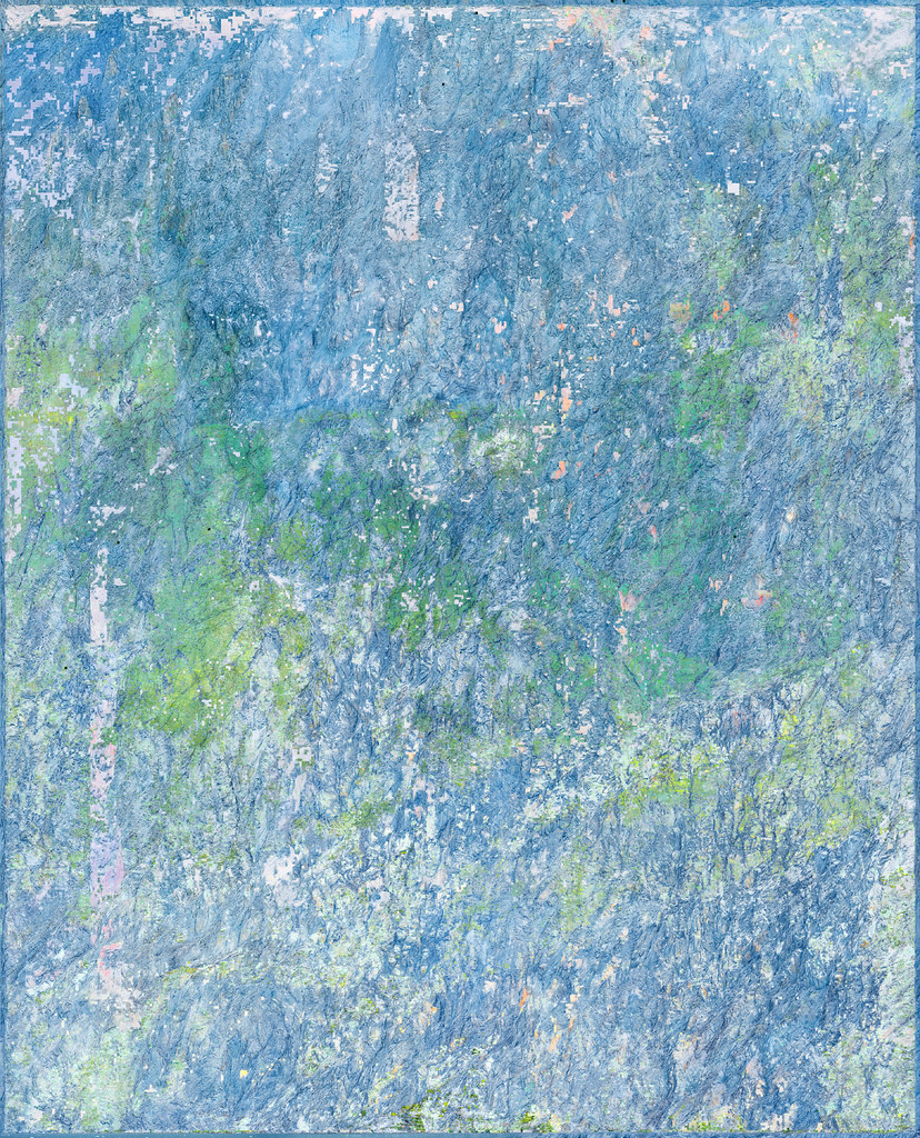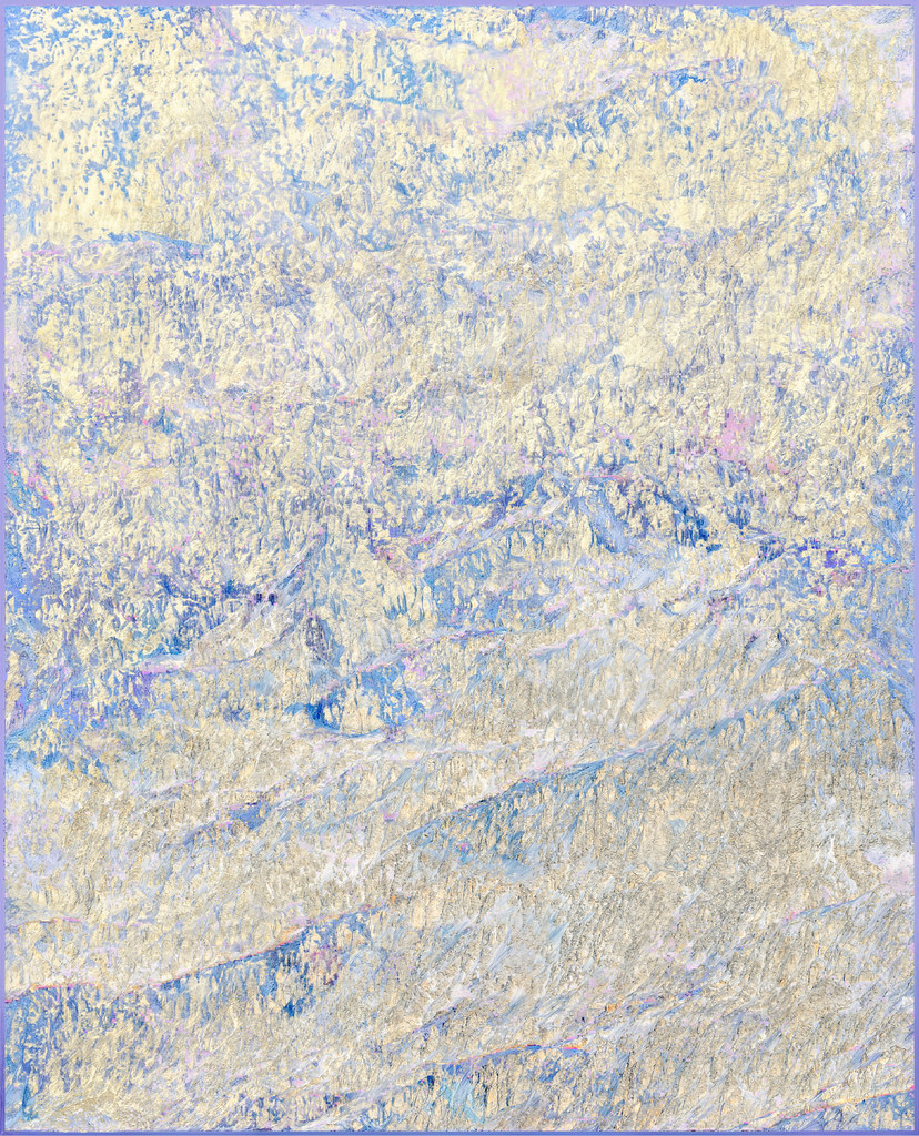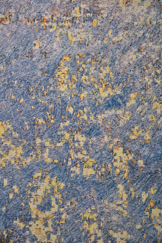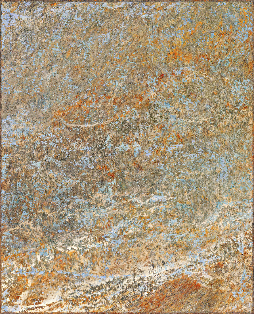 Dans cette opération, les modèles analysent les informations textuelles associées au contenu de l’image pour reconstituer vectoriellement ce que le processus créatif a volontairement fait disparaître. Un algorithme industriel standard d’agrandissement est paramétré de manière à circonscrire précisément l’espace de recherche des formes à un paysage de montagne, permettant une complétion ciblée des zones dégradées. Cette tension productive entre intention plastique et reconstruction automatisée guidée par des descriptions linguistiques contraint l’algorithme à retrouver, dans le bruit et les artefacts visuels, les éléments texturés de rocher et de glace d’une montagne devenue illisible, transformée en un vaste all-over minéral qui occupe l’intégralité de la surface picturale.