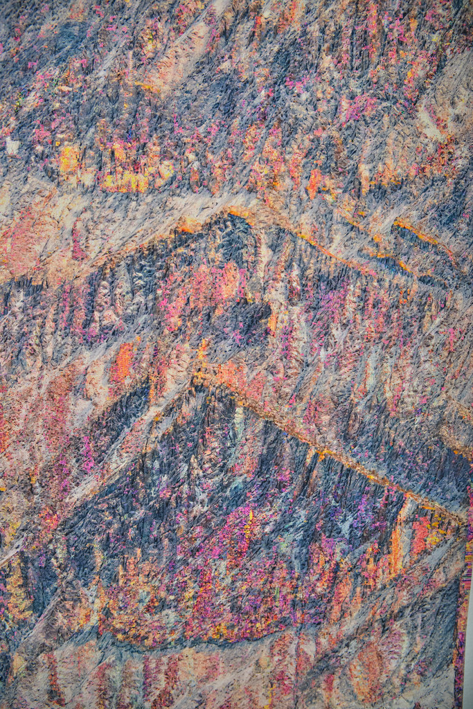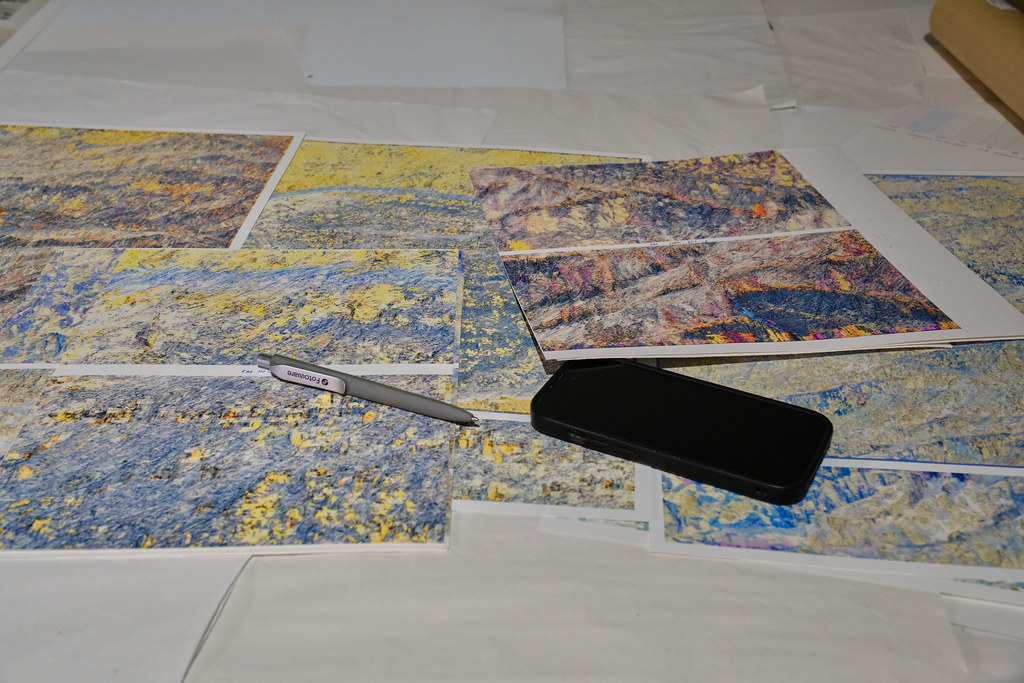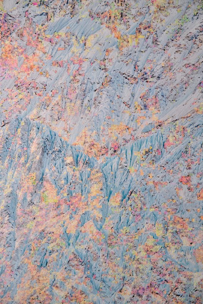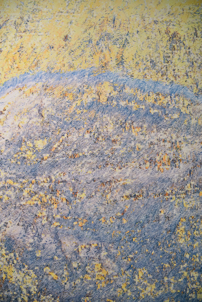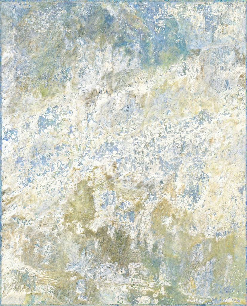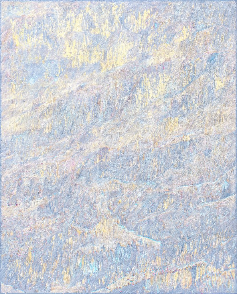 Dans cette opération, les modèles analysent les informations textuelles associées au contenu de l’image pour reconstituer vectoriellement ce que le processus créatif a volontairement fait disparaître. Un algorithme industriel standard d’agrandissement est paramétré de manière à circonscrire précisément l’espace de recherche des formes à un paysage de montagne, permettant une complétion ciblée des zones dégradées. Cette tension productive entre intention plastique et reconstruction automatisée guidée par des descriptions linguistiques contraint l’algorithme à retrouver, dans le bruit et les artefacts visuels, les éléments texturés de rocher et de glace d’une montagne devenue illisible, transformée en un vaste all-over minéral qui occupe l’intégralité de la surface picturale.